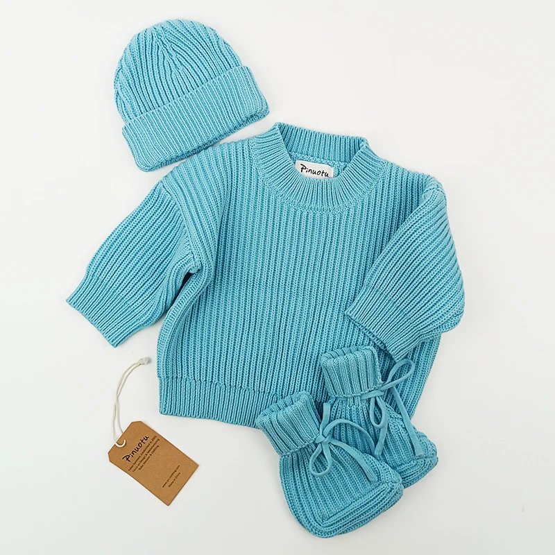 Pinuotu Baby Knit Set Winter Chunky 2pcs Clothing Sets Kids Beanies Sweater Knit Suit Custom Knitwear Blue Outfit $11.00